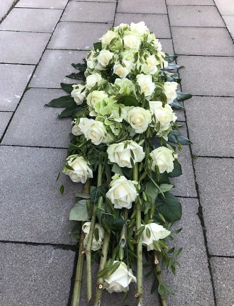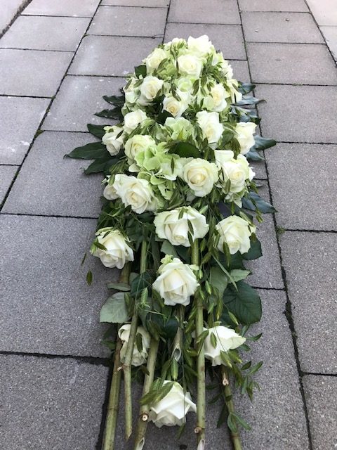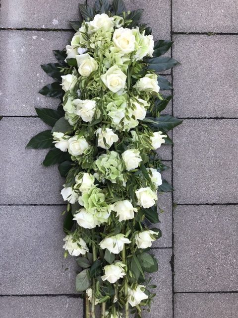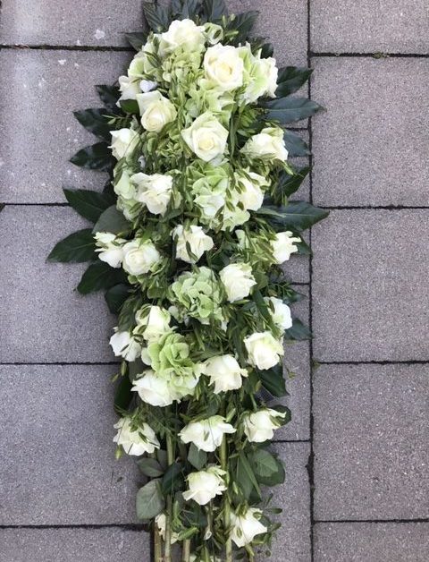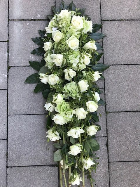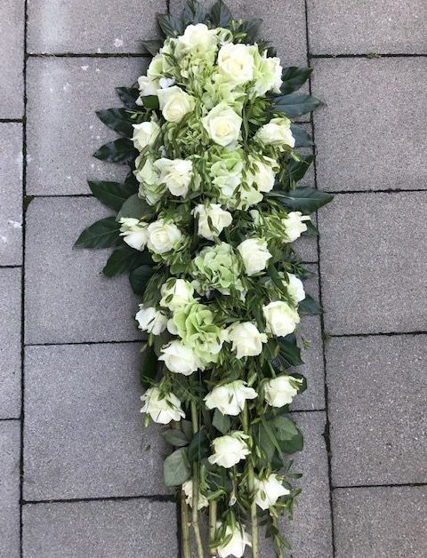 Elegant langwerpig bloemstuk met witte rozen en hortensia.