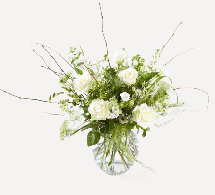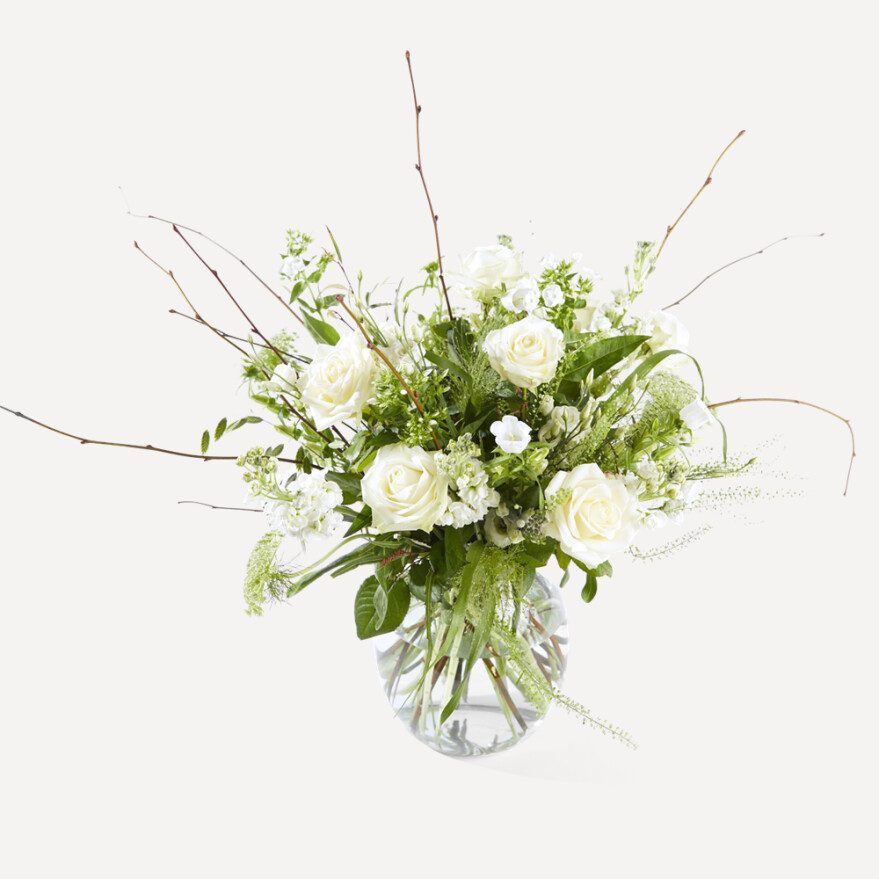 Boeket met witte rozen en fijne witte seizoensbloemen afgewerkt met fijn groen. Ideaal om in het funerarium bij de overledene te plaatsen (indien gewenst kunt u dit aangeven bij notities bij afrekenen).