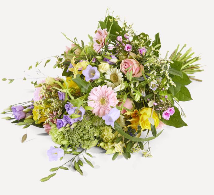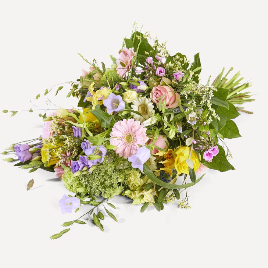 Liggend rouwboeket met natuurlijk aanzicht, bestaande uit variatie aan bloemen. (lengte van de stelen variabel)