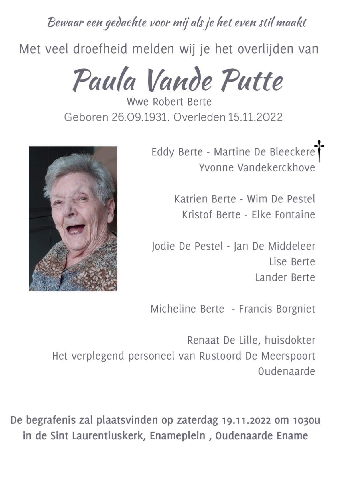 Paula Vande Putte 26/09/1931 15/11/2022 weduwe Robert Berte †2008 De uitvaartliturgie heeft plaats op zaterdag 19 november 2022 om 10.30 uur in de Sint-Laurentiuskerk te Oudenaarde-Ename. Bestel een bloemRouwbrief Condoleren Schakel JavaScript in je browser in om dit formulier in te vullen.Naam *Gemeente *E-Mail *WILT U EEN FOTO MET DE FAMILIE DELEN? Drag & Drop Files, Choose Files to Upload Bericht *Gekozen condolatie *mijn bericht is enkel voor familie bedoeldmijn bericht mag openbaar geplaatst wordenBevestiging termen en condities *Ik ga akkoord met de algemene voorwaarden en de privacy policyEmailVerzenden
