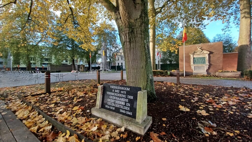 Bij het binnenrijden van Oudenaarde staat op het Tacambaroplein een prachtige linde in zijn herfstjas van gele bladeren. In de ochtendzon op 11 november herdenken we het einde van WOI en WOII met de verbroedering der Oudenaardse oudstrijders en gelijkgestelden. In 1975 werd hiervoor een zilverlinde aangeplant en in de schaduw van deze “rechtsboom” valt de ochtendstilte neer voor het herdenkingsmoment dat er plaatsvindt.