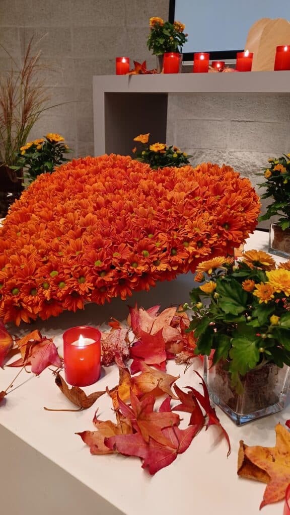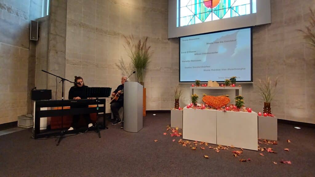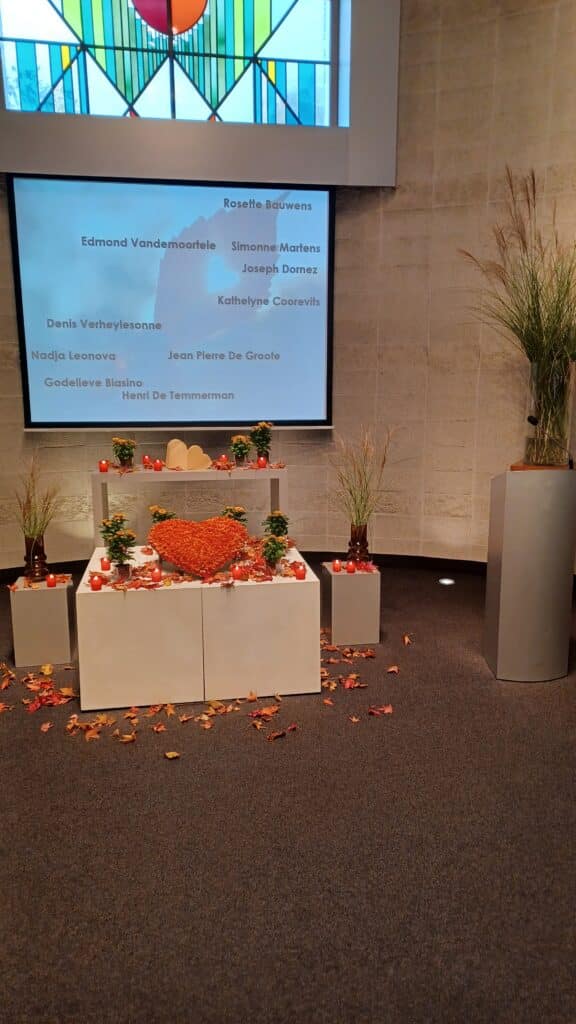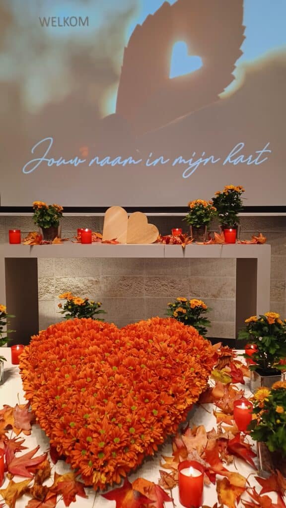 Deze namiddag noemden we de namen van hen die we dierbaar zijn en waarvan we afscheid moesten nemen. Tijdens de 2 herdenkingsdiensten stonden we even stil bij het leven en het afscheid nemen. Met muzikale ondersteuning van Pat Van Daele en Laura Duymelinck en sfeervolle herfstdecoratie werd het een warm moment.
