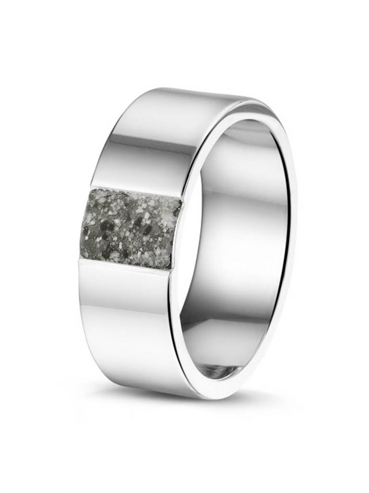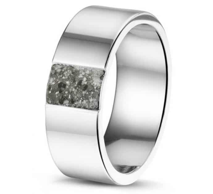 Stalen ring. Dit sieraad wordt zichtbaar aan de voorkant gevuld met as en wordt vermengd met een speciale hars.